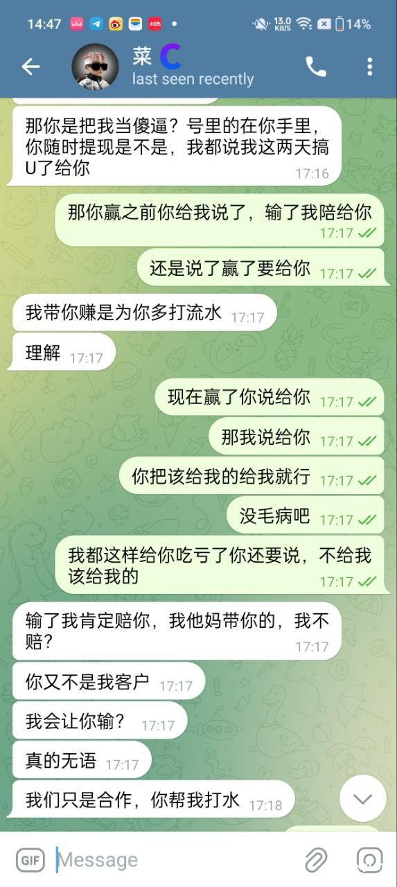 (声明本人不是傻逼从来没信过他说的一个月一百多万,只是钱在他那一直陪他演戏,只为了能拿到我的辛苦费,现在佣金和输钱他全都不给)